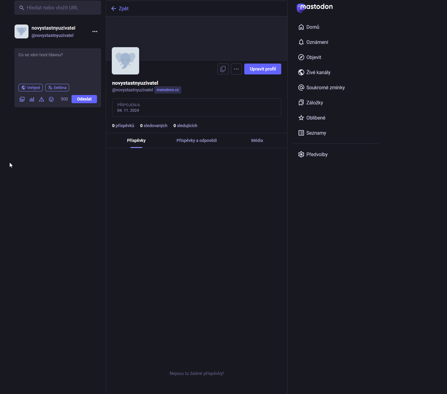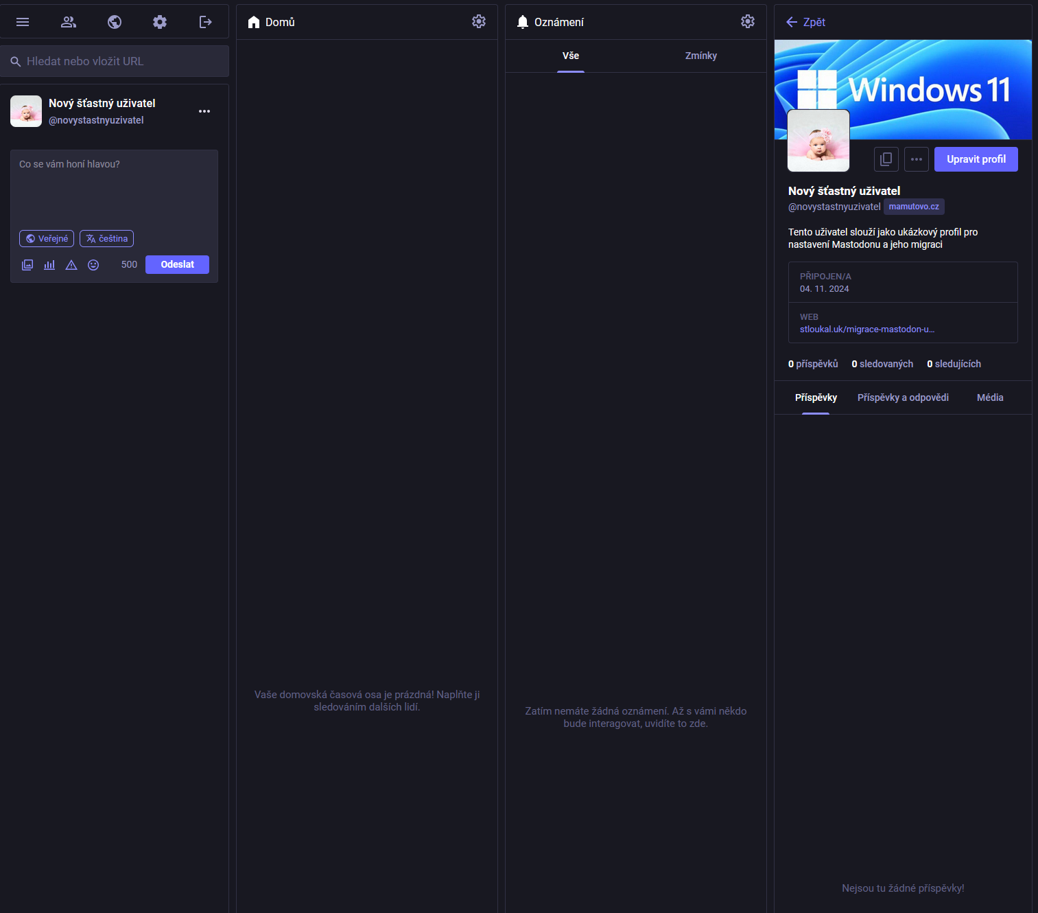 Klikneme vlevo nahoře v menu na Zpět na Mastodon a jsme na svém novém účtu. Kliknutím na svoje jméno vedle profilové fotky si můžete zobrazit info a detaily o nového účtu. Jak vidíte, zatím máme 0 příspěvků, 0 sledovaných, 0 sledujících. Takže jdeme MIGROVAT.