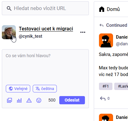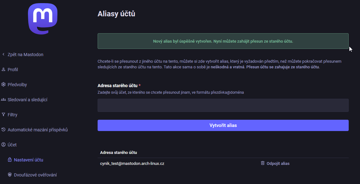 Abychom se v tom vyznali, uděláme to takto. Budeme přenášet účet @cynik_test@mastodon-arch-linux.cz na účet @novystastnyuzivatel@mamutovo.cz .