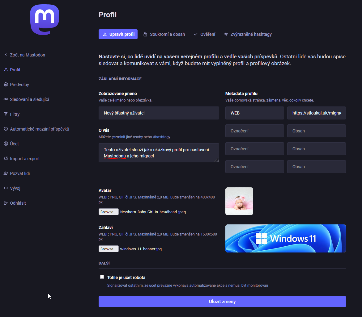 Zbytek nastavení si projdeme příště, ale vzhledem k tomu, že přecházíte z jiné instance, máte to v malíku. Jedné co na novém profilu doporučuji nastavit hned a nezapomenout je na kartě Soukromí a dosah nastavit viditelnost příspěvků ve vyhledávání a viditelnost profilu a zase samozřejmě Uložit.